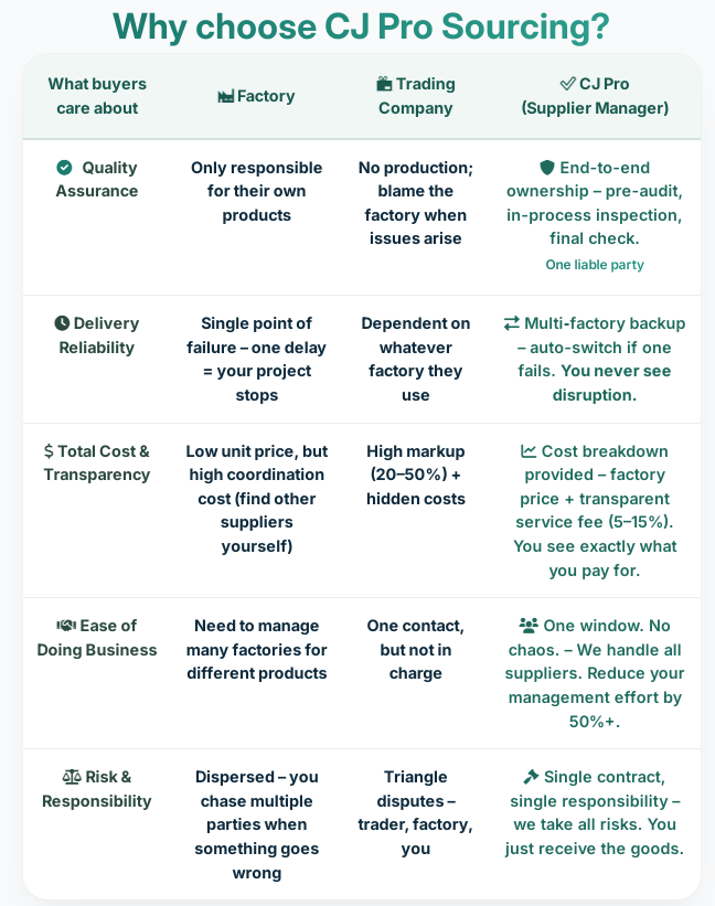 Shanghai CJ Pro Sourcing Co., Ltd. is not a conventional trading company — we are a supply chain integration expert. With a dedicated team of sourcing specialists, quality engineers, and logistics coordinators, we bridge the gap between international buyers and reliable Chinese manufacturers.